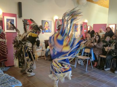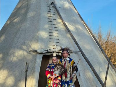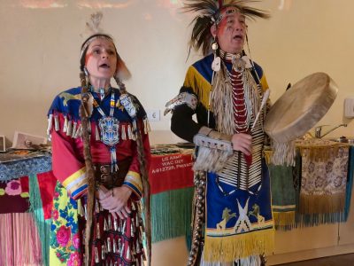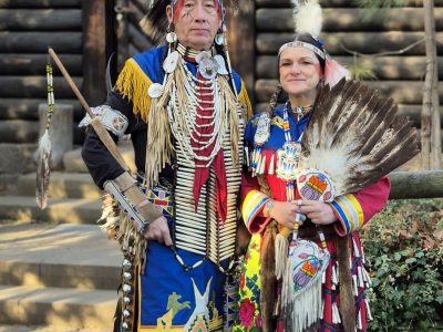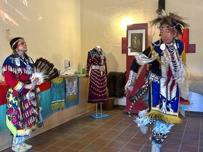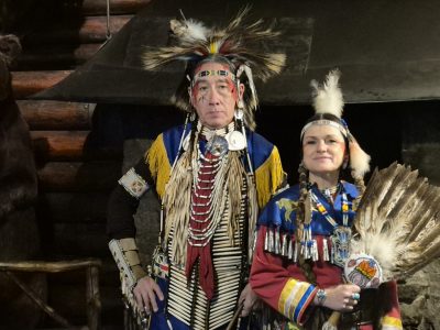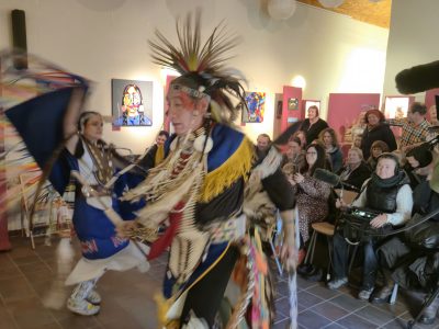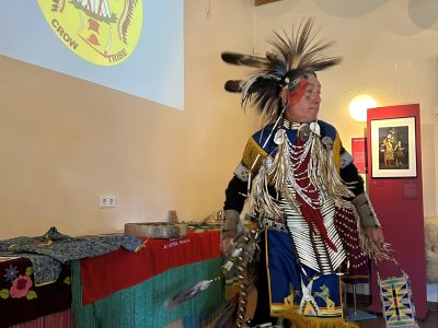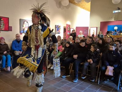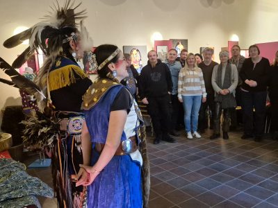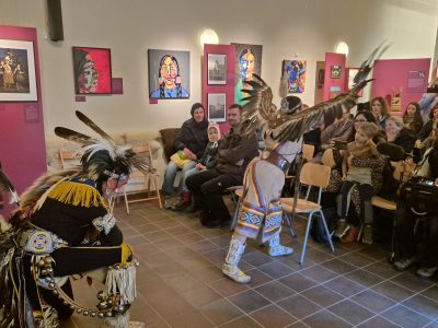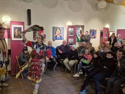 Highlight des ersten „Indigenen Novembers“ im Karl-May-Museum waren Kendall & Maria Old Elk (Apsaalooke – Crow). Ihrem Bann konnten sich selbst ein sonst ja eher zurückhaltendes deutsches Publikum nicht entziehen. Das charismatische Paar holte die Zuschauer von ihren Stühlen und bewegte sie zum ausgelassenen Tanzen. Auch ein paar Worte in der universellen Zeichensprache der Indianer lehrte er das Publikum. Doch meist lauschte das Publikum andächtig den weisen Worten Kendall Old Elks, der wie kein anderer versteht, seine Botschaft eindringlich aber sanft zu vermitteln.