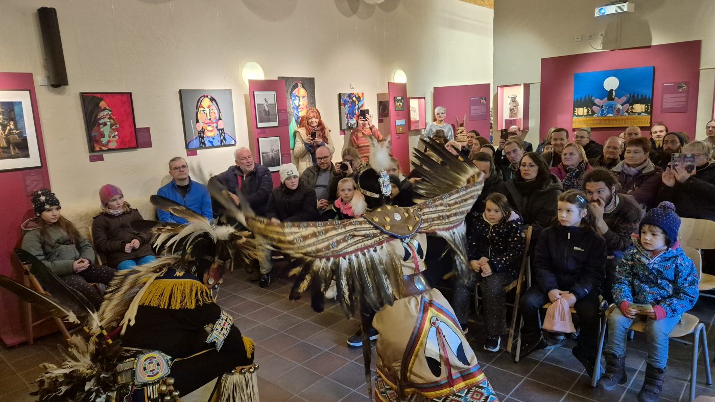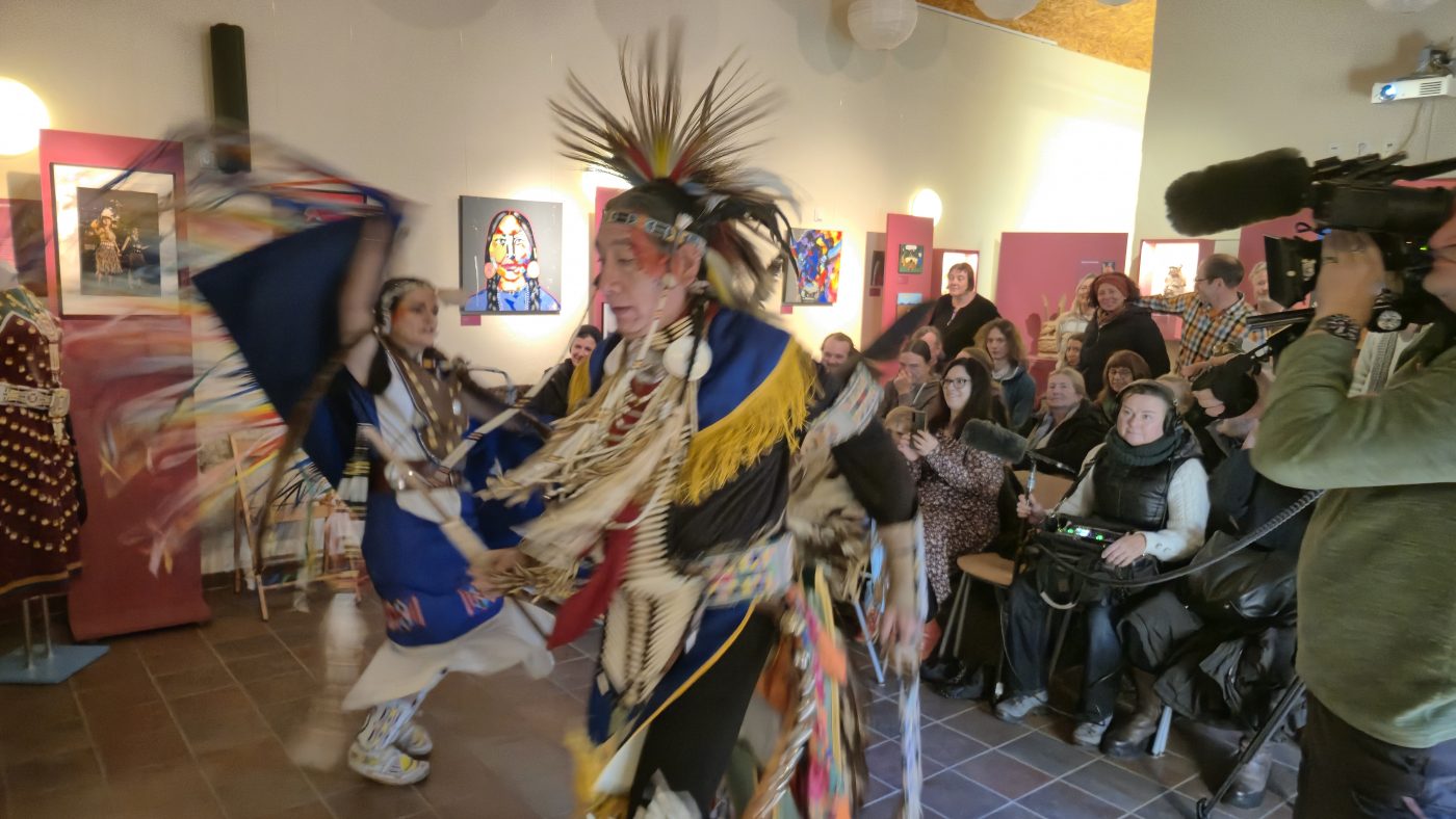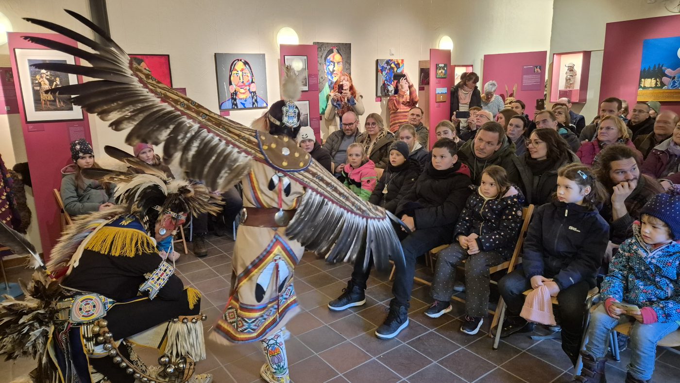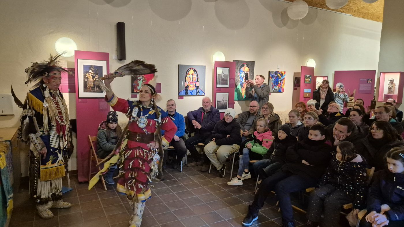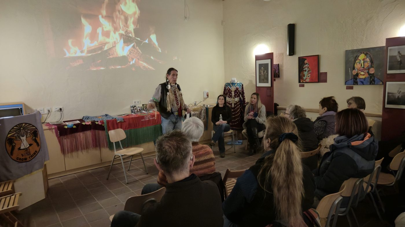 Highlight des ersten „Indigenen Novembers“ im Karl-May-Museum waren Kendall & Maria Old Elk (Apsaalooke – Crow). Ihrem Bann konnten sich selbst ein sonst ja eher zurückhaltendes deutsches Publikum nicht entziehen. Das charismatische Paar holte die Zuschauer von ihren Stühlen und bewegte sie zum ausgelassenen Tanzen. Auch ein paar Worte in der universellen Zeichensprache der Indianer lehrte er das Publikum. Doch meist lauschte das Publikum andächtig den weisen Worten Kendall Old Elks, der wie kein anderer versteht, seine Botschaft eindringlich aber sanft zu vermitteln.