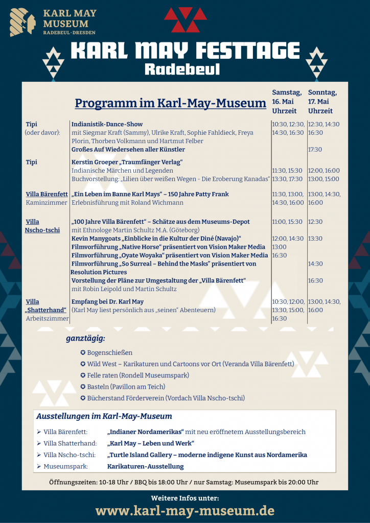 KMF 2026 – Programm KMM Scharren Sie auch schon mit den Hufen? Am Wochenende nach Himmelfahrt ist es wieder so weit. Radebeul – Wohnort und kreative Quelle Karl Mays – gibt das größte Fest des Jahres zu Ehrendes Schriftstellers. Gemeinsam mit dem Kulturamt der Stadt Radebeul richtet das Karl-May-Museum die mittlerweile 33. Festtage aus.