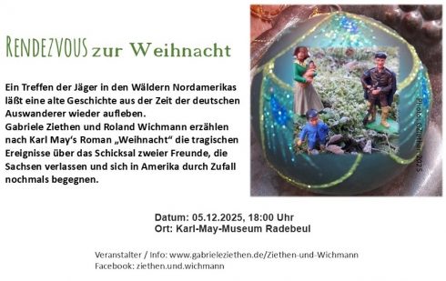 Ein Treffen der Jäger in den Wäldern Nordamerikas lässt eine alte Geschichte aus der Zeit der deutschen Auswanderer wieder aufleben. Gabriele Ziethen und Roland Wichmann erzählen nach Karl Mays Roman „Weihnacht“ die tragischen Ereignisse über das Schicksal zweier Freunde, die Sachsen verlassen und sich in Amerika durch Zufall nochmals begegnen.